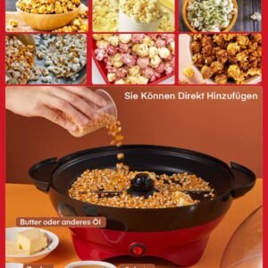 FOHERE-Home Popcornmaschine, 5,5 L Popcornmaschine mit Zucker, Öl, Butter, Antihaftbeschichtung und abnehmbarer Heizfläche, leise und schnell, großer Deckel als Servierschale